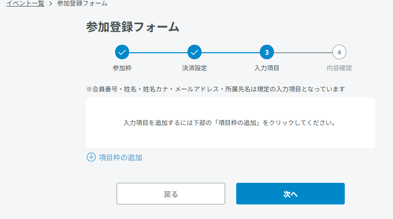 ※会員番号・姓名・姓名カナ・メールアドレス・所属先名は規定の入力項目となっているので、その他の項目を設定したい場合に行います。